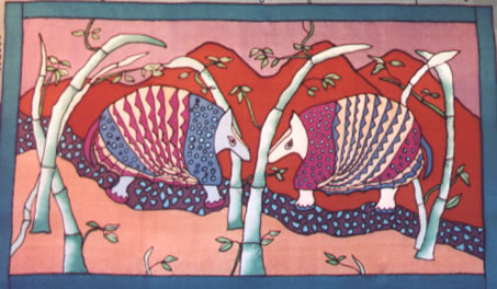 Soft Hangings have a sleeve for a hanging rod sewn at the top border. They are painted on Silk Satin or Habatai Silk. The backing, top and bottom borders are Silk Noil.